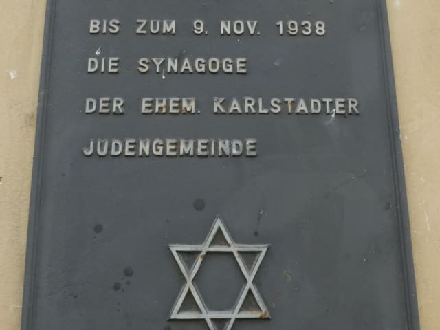In dem Gebäude in der Hauptstraße 24 in Karlstadt befand sich einst die Synagoge der jüdischen Gemeinde von Karlstadt, worauf auch ein Messingschild aufmerksam macht. Dies endete in der Nacht vom 9. auf den 10. November 1938, als die NAZI-Trupps mit Unterstützung der „lieben, guten, braven Bürger_innen“ Karlstadts die Synagoge schändeten und die Einrichtung und Ritualien zerstörten. In dem Gebäude war auch ein Zimmer, in dem Religionsunterricht für die Kinder abgehalten wurde. Deswegen wurde und wird die ehemalige Karlstadter Synagoge auch als „Judenschul“ bezeichnet.