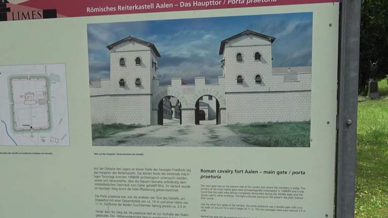 In Aalen war das wichtigste Kastell am raetischen Limes. Noch heute sind Teile sichtbar. Im städtischen Friedhof ist die Lage der Porta Praetoria markiert. Eine große Informations-Tafel zeigt den Standort auf und erinnert daran. Adresse: Friedhofstraße 32, 73430 Aalen Geodaten: R3PP+JJ Aalen