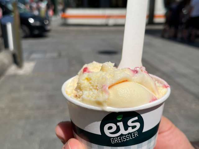 Auf der Suche nach einem guten Eis sind wir mitten in Linz in der Spittelwiese 2 bei Eis-Greissler gelandet und wurden nicht enttäuscht, ganz im Gegenteil. Die Kugel kostet 2,20 Euro, für 2 Kugeln zahlt man 3,90 Euro. Vor dem Laden war eine Schlange, man wurde aber sehr schnell und freundlich bedient. Unsere gewählten Sorten Grießschmarrn und Butterkeks waren sehr lecker.