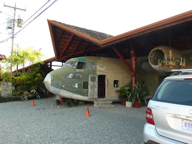 Wir hatten bereits in unserem Reiseführer von diesem Restaurant gelesen und beim Vorbeifahren in Richtung Nationalpark Manuel Antonio fiel uns das wieder ein. Das Flugzeug ist beim Vorbeifahren wirklich nicht zu übersehen und wir beschlossen sofort, nach dem Parkbesuch hier einzukehren. Das Flugzeug ist ein umgebautes Fairchild C-123-Transportflugzeug, das die CIA in den 70ern für Waffenlieferungen benutzte. Heutzutage findet man im Inneren eine Bar und rundherum wunderschön angelegt das Restaurant. Eine Holztreppe führte nach oben, wo sich noch eine Theke befand. Alles stilvoll und angenehm eingerichtet mit Holz (und Flugzeugteilen), Besonders interessant fanden wir den Essensaufzug, auch ein umgebautes Flugzeugteil. Essensmäßig normalpreisig für Costa Rica, es findet sich eine bunte Auswahl an Reisgerichten, Pasta, Fisch und Fleisch. Nichts übertriebenes, genau richtig nach dem NP-Besuch. Das Personal ist sehr aufmerksam (beim Apfelkuchen für meinen Mann wurde ein zweiter Löffel für mich beigelegt). Leider hatten wir unser Hotel nicht direkt in Manuel Antonio, sonst wären wir sicher abends mal in die Bar gegangen. Absolut empfehlenswert!
