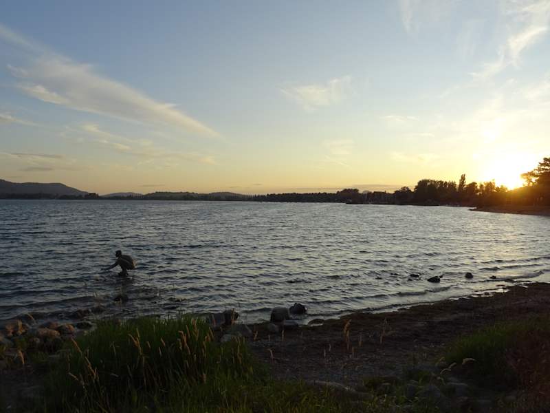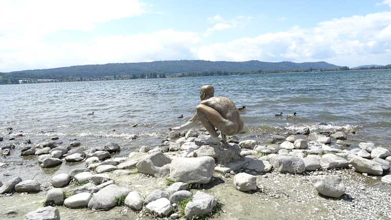An der Skulptur kann man besonders gut den aktuellen Wasserstand erkennen. Bei unserem letzten Besuch in Radolfzell in 2024 war die Figur im Wasser - jetzt im Mai 2025 konnte man sie trockenen Fußes erreichen.