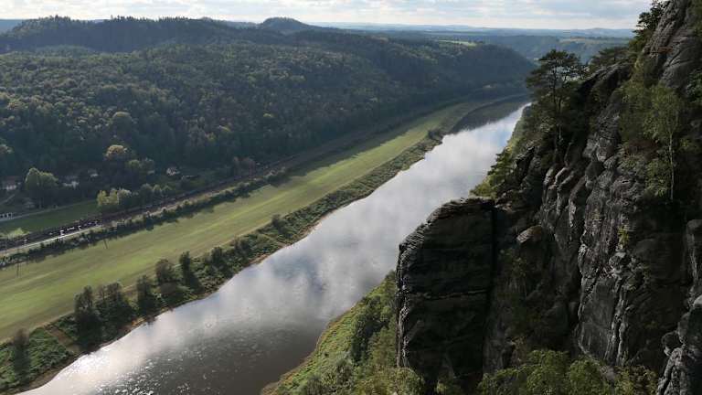 Ca. 50 km südöstlich von Dresden in der Grenzregion von Sachsen zu Tschechien befindet sich das Elbsandsteingebirge. Ein kleiner Fußweg vom großen Parkplatz aus und schon ist man an der Bastei und dem Panoramarestaurant. Von dort hat man einen sehr schönen Blick auf die Elbe. Die berühmte Basteinbrücke und der Blick auf die Felsformation der Schrammsteine und dem Tafelberg Pfaffenstein mit der Barbarine sind toll anzusehen. Wenn man Glück hat sieht man auch einige Kletterer die auf die Steine klettern oder sich abseilen.