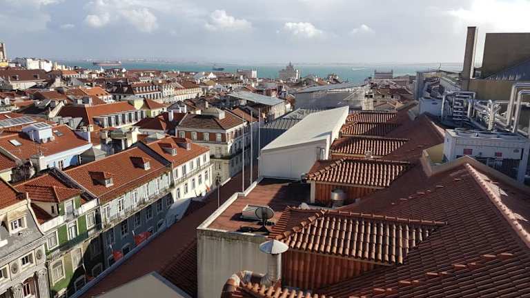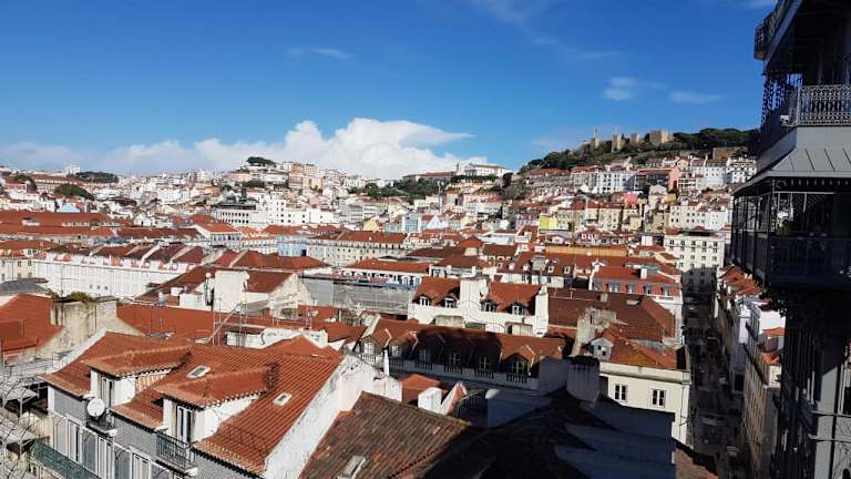 Die Fahrt zur Aussichtsplattform mit dem Blick über die Stadt kostet zwar etwas, ist jedoch wesentlich bequemer als der Aufstieg über die Treppen. Von oben hat man einen schönen Ausblick über weite Teile von Lissabon.