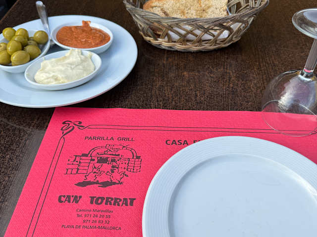 Immer wenn wir die letzten Monate auf Mallorca an der Playa waren, konnten wir die Renovierung eines Gebäudes beobachten. Als wir im April ankamen, sahen wir das Ergebnis. Es ist ein neues Restaurant entstanden. Sehr, sehr schön geworden. Es liegt nah am Strand zwischen Riu Center und der Playa. Gleich neben der kleinen Kirche. Seit vielen Jahren gibt es schon das Hauptlokal in Las Maravillas kurz vor der Autobahnauffahrt, hinter dem Kreisel. Dort waren wir auch schon vor einigen Jahren essen. Nun war uns klar, wir müssen es testen. Die Einrichtung hat uns schon mal sehr gut gefallen und wir bestellten 2 Entrecotes. Ich sagte dem Kellner, daß ich gerne Pommes Frites und Alioli dazu haben möchte. Er meinte, daß es dabei war, obwohl es als Extra in der Karte aufgeführt war. Dann kam die Frage, ob wir Oliven usw. möchten. Da wir keine Oliven mögen, verneinten wir es. Die Salatauswahl sprach mit nicht an. Diese südländische Art und Weise Essig und Öl auf den Tisch zu stellen, ist auch nicht meins. Wir mögen lieber geschmacklich feinabgestimmte Dressings und feine Salatvariationen. Dann kamen die Steaks, die auf einem Buchenholzgrill gegrillt wurden. Es roch sehr lecker und waren auch perfekt gebraten. Zart und saftig. Nun wartete ich noch auf die Pommes. Fragend schaute ich nach dem Kellner. Es war wohl nicht vorgesehen. Er brachte dann noch Alioli und Pommes. Die Pommes habe ich gleich zurückgehen lassen. Dunkel und vor fett triefend. Die zweite Portion war geringfügig besser. Sie wurden in einer ovalen Schale mit kleinen Paprikastücken serviert. Ich weiß nicht, ob es die spanische Version war. In Deutschland würde man sagen, das Fett war alt. Jede Kultur hat ja ihre eigene Art der Zubereitung. Hinzu lag es wohl auch an Verständigungsschwierigkeiten. Ich weiß nicht. Fazit das Fleisch war hervorragend, doch das Gesamtpaket war für uns nicht stimmig. Außerdem war die Tischmusik für uns nervig. Agressive Töne, nicht die gewohnte melodische Tischmusik. Wir haben für das Entrecote 15, 30 Euro bezahlt. Patatas und Alioli kamen je 1, 20 Euro. Salate fingen bei 4, 90 Euro an. Ich kann nicht sagen, daß ich es nicht empfehlen kann, nur für uns war es nicht das Richtige. Ca'n Torrat, San Ramón Nonat 3 , Plaza de las Maravillas Playa de Palma Tel. 971/262566 Öffnungszeiten von 12: 00 bis 24: 00 Uhr