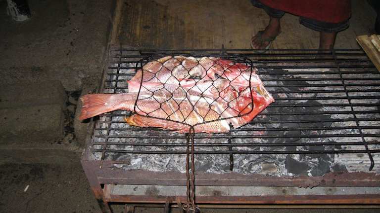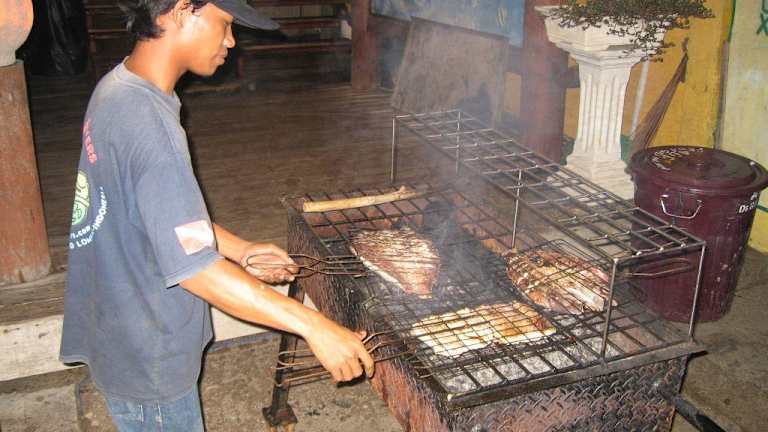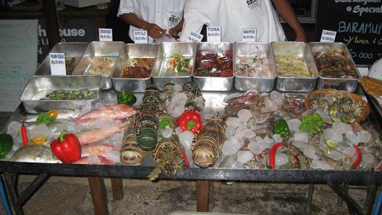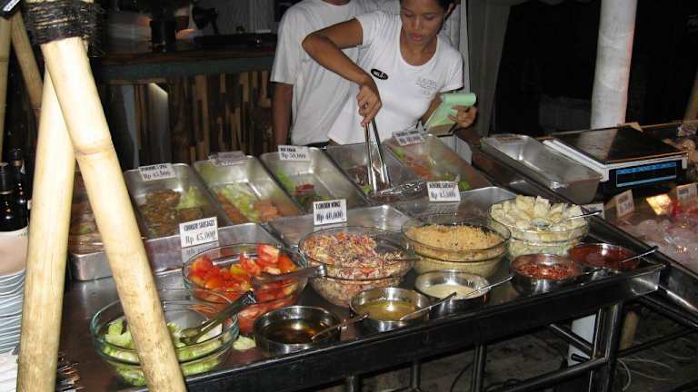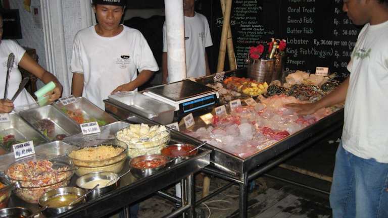 An der Uferstrasse am Oststrand von Trawangan befinden sich jede Menge Restaurants, die direkt am Strand gelegen sind. Vor den Restaurants wird in eisgekühlten Truhen das Angebot des Tages präsentiert. Der Holzkohlegrill (der auch mit Kokosnussschalen beheizt wird) steht direkt daneben. Die Preise (inklusive einem Salatteller, den man sich am Buffet zusammenstellen kann) sind sehr günstig. Steak für 1, 50-2, 00 Euro, Fisch nach Grösse zwischen 1, 50 und 3 Euro. Natürlich kann man auch ala Cart essen. Aber bei diesem Angebot (siehe auch die Bilder hierzu) haben wir sehr oft vom Grill gegessen.