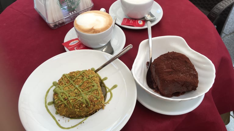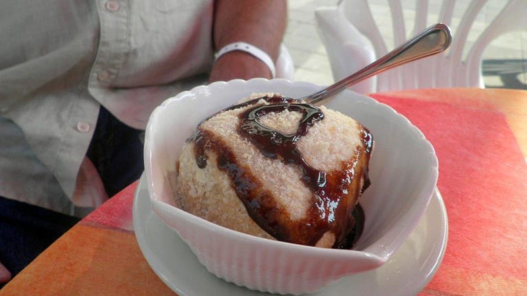 Das leckere Eis muß man gegessen haben. Außen Schokoladeneis mit Kakau bestreut, innen Nusseis und dann der flüssige Kern aus Schololade. Man achte auf die Eisdiele mit dem Chef (rote Schürze) und den grünen Stühlen.