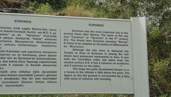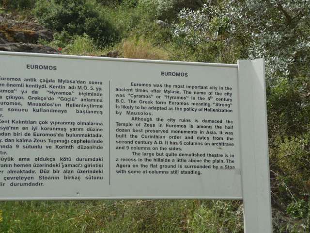 An der Strasse vom Bafasee nach Milas liegt inmitten malerischer Olivenhaine die Ruine des Zeustempels der antiken Stadt Euromos. Der Zeustempel entstand im 2. Jahrhundert und gilt als einer der besterhaltensten Tempel Asiens. Die Ruine ist ruhig gelegen, die schmale Zufahrtsstrasse und der kleine Parkplatz bieten sich wohl nicht an fuer Touristenbusse. Die Landschaft ist malerisch, und wer mag, kann dem Trampelpfad den Huegel hinauf folgen und nach den Ueberresten des antiken Theaters und der Stadtmauer suchen.