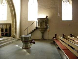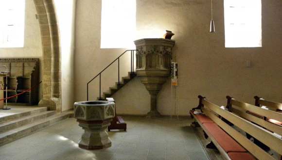 Die täglich geöffnete Kirche St. Johannis zu Feuchtwangen besuchten wir im September 2014. Neben der Stiftskirche steht auf dem Kirchplatz die evangelische Pfarrkirche St. Johannis, in ihr stehen der Taufstein und das Gestühl für die Kirchenvorstände. Beide Kirchen bilden zusammen das bekannte „Vier-Türme-Motiv“ der fränkischen Gemeinde Feuchtwangen. Die Taufkapelle des einstigen Königshofes wurde 1257 die urkundlich belegte Pfarrkirche neben der Klosterkirche. Anfang des 15. Jahrhunderts Erweiterung des ursprünglichen romanischen Kirchenbaus im Stil der Gotik. Nach der Reformation im Jahre 1525 evangelisch-lutherische Kirche. Sie ist dem Apostel Johannes dem Täufer geweiht, von dem eine hölzerne Statue vorhanden ist. Der noch heute bestehende barocke Hochaltar und die geschnitzte Kreuzigungsgruppe stammen aus dem Jahre 1680. Der Taufstein, das Sakramentshäuschen, eine Stiftung der Familie Ehenheim und die Kanzel datieren aus dem 15. Jahrhundert, ebenso wie der Epitaph des Schwanenritters Jörg von Ehenheims. Auf diesem Grabesbild kniet die lebensgroße Gestalt des Ritters Jörg von Ehenheim zu Forndorf, der von 1486 bis 1499 Oberamtmann zu Feuchtwangen war.