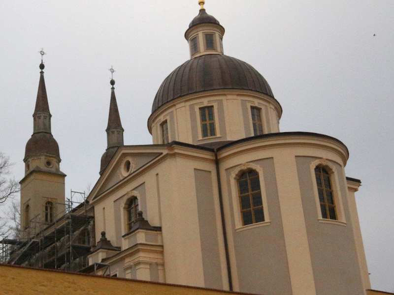 Die an der Klostermauer erbaute und dem Hl. Aegidius geweihte evangelische Kirche zum Hl. Kreuz auf dem Gelände des Klosters Neuzelle in dem brandenburgischen Städtchen Neuzelle besuchten wir Anfang März 2014. Leider konnten wir aufgrund von Bauarbeiten das Gotteshaus nur von außen besichtigen. Sie steht am westlichen Rand des Klostergartens und wurde als Pfarrkirche „Zum Heiligen Kreuz“ für die örtliche Bevölkerung genutzt. Erbaut wurde sie an der Stelle einer älteren Pfortenkapelle von 1728 bis 1734 für die katholischen Gläubigen des früheren Ortes „Schlaben“. Das äußerlich schon beeindruckende Gebäude mit den Zwillingstürmen im Westen wird über der Apsis im Osten von einer Kuppel mit Turmaufsatz gekrönt. Die „Kreuzkirche“ ist seit 1818 evangelische Pfarrkirche.