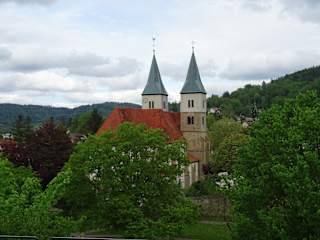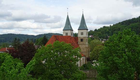 Die imposante Stadtkirche gehörte offenbar früher - vor der Reformation - zum Benediktinerkloster. Die Türme stammen wohl aus dem 11. Jahrhundert, das Kirchenschiff aus dem 15. Jahrhundert. Insgesamt wechselte die Stadt und die Kirche mehrmals zwischen katholisch und evangelisch - entsprechend wurden Veränderungen an der Kirche vorgenommen.