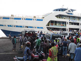 Die Fährüberfahrt von Goma nach Bukavu geht morgens um 7.30 Uhr los, dauert ~7 Stunden und es sind ~110 Km Entfernung über den See. Das große Schiff "La Perle du Lac Kivu" ist älter, aber noch in akzeptablem Zustand. Es gibt 3 Klassen von 10-25 $/USD, wobei sich für Touristen die 1. Klasse im obersten Deck anbietet. Kostet 25 $/USD und hier gibt es umsonst Gebäck, Kaffee und Tee. Wie überall in Afrika ist alles überfüllt, außer die 1. Klasse. Ausländer fahren kaum mit und es gibt einfache Kabinen, die aber kaum benutzt werden. Restaurant ist in Ordnung und das Essen passabel. Alles in allem eine nette und kurzweilige Überfahrt.