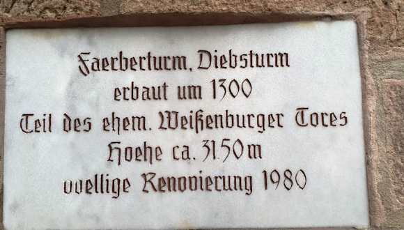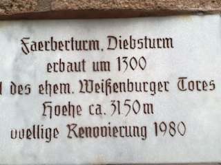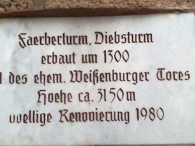 Der Färberturm hat noch einige Namen mehr, wie den Pulverturm oder den Diebsturm und ist aus dem 14. Jahrhundert, gehörte zur Stadtbefestigung, den Namen hat er von der unten liegenden Färberei, in der Höhe sind die dort alle gleich, auch dieser hat 31,5 Meter. . Adresse: Weißenburger Straße 13 91710 Gunzenhausen
