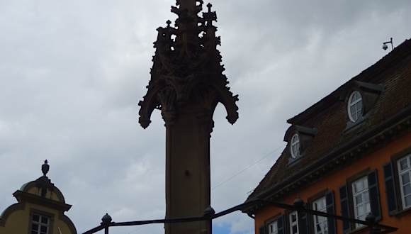 Sehr schöner gotischer Brunnen direkt am Marktplatz. Früher wurde er an Markttagen als Fischdepot benutzt. Der Brunnen stammt aus Anfang des 16. Jahrhunderts und wurde mit dem Pranger vom Haller Bildhauer Hans Beuscher geschaffen. Kleinere Vergehen wurden hier am Pranger abgebüßt. Das Urteil wurde bei der Gerichtslinde bei der Kirche öffentlich getroffen. Blickt man vom Brunnen oberhalb des Gasthofs/ Hotel Goldener Adler sieht man noch die frühere Brandmauer, die im 18. Jahrhundert die Gebäude hangaufwärts vor dem großen Stadtbrand bewahrte.