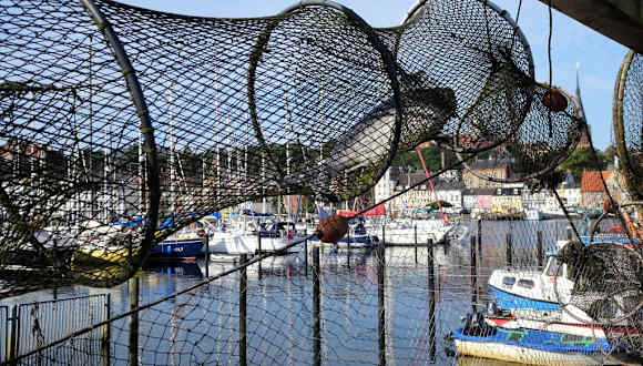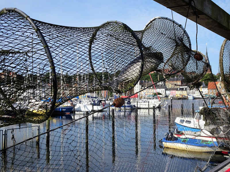 Zwischen den vielen historischen Booten und modernen Yachten findet sich am Ostufer der Fördespitze der Fischereihafen, den man beim Rundgang am Wasser glatt übersehen könnte. Bereits 1872 gründeten die Fischer den „Flensburger Fischereiverein“, in dem noch heute 50 gewerbliche Küstenfischer organisiert sind. Mit den eher kleinen Booten geht es auf Fangreise in die Fördemündung und per Angel, Reuse oder Netz wird dort Hering, Dorsch, Flunder, Steinbutt und Aal gefangen. Traditionell findet im Fischereihafen jeweils am Sonntag ein Verkauf direkt aus dem Boot statt – frischer geht es einfach nicht! Mit eigener Slipanlage, Räucherofen, Reusen und Netzen ist der Rundgang durch den beschaulichen Fischereihafen wirklich spannend und beleuchtet ein fast historisches Kapitel der Küstenfischerei. In Zeiten von Fabrikschiffen und gigantischen Aquakulturen behauptet sich der nachhaltige und saisonal sehr selektive Fang mit kurzen Wegen und unschlagbarer Qualität wieder zunehmend – ein erfreulicher Trend, der auch den Fischereihafen von Flensburg deutlich belebt.