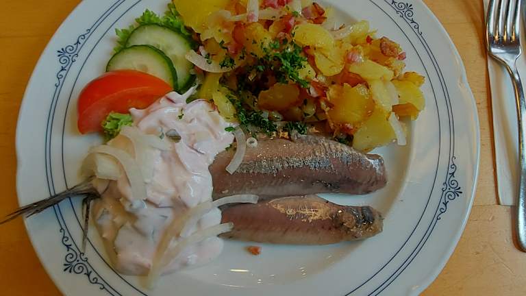 Auf Bruns Website ist zu lesen: „Unsere Restaurant-Läden“. Es gibt zwei in Bad Zwischenahn. Ich habe das Restaurant in der Peterstraße besucht. Ausgesucht hatte ich mir die hausgemachte Fischfrikadelle und den schwäbischen Kartoffelsalat. Die bedienende Dame schien nicht so gut drauf zu sein und die Frikadelle war natürlich kalt und musste in die Mikrowelle. Die Dame ging folglich mit dem Teller dorthin und ich wartete. Während sie andere Kunden im Laden am Verkauf beratend bediente, drehte vermutlich die Fischfrikadelle ihre Runden. Ich kürze es ab: Es waren wohl der Runden zu viele, so dass die Frikadelle dröge war. Dass sie untendrunter teils auch schwarz war, hab ich nicht sofort gemerkt, da eben nur teils schwarz. Na ja, dumm gelaufen. Satt war ich dank des Kartoffelsalats geworden. Einen weiteren Versuch im Restaurant-Laden habe ich nicht gestartet.