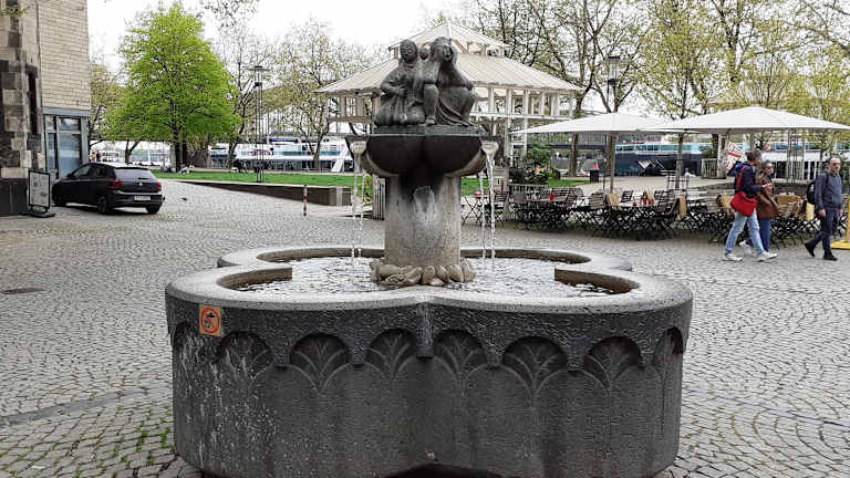 Der "Fischweiberbrunnen" steht auf dem Kölner Fischmarkt am Rheinufer im Herzen der Kölner Altstadt. Der Platz war früher ein wichtiges Zentrum für den Fischgroßhandel. Hier wurden Heringe, Stockfische, Bücklinge, Schollen und anderes gehandelt, konserviert, gelagert und umgepackt. Zur Erinnerung an diesen Fischmarkt wurde auf dem Platz im Jahr 1986 anlässlich des 100-jährigen Bestehens der Kreishandwerkerschaft der von dem Kölner Steinmetz Rainer Walk geschaffene Brunnen aus Basaltlava errichtet. Aus dem unteren Wasserbecken erhebt sich eine Säule, die auf Höhe der Wasseroberfläche von einem Ring aus Fischen, einer Schnecke, einem Papierschiffchen und einer Meerjungfrau umschlossen ist. Die Säule wiederum wird von vier stilisierten Marktfrauen bekrönt, die verschiedene Typen verkörpern. Homepage: https://www.stadt-koeln.de/artikel/71640/index.html