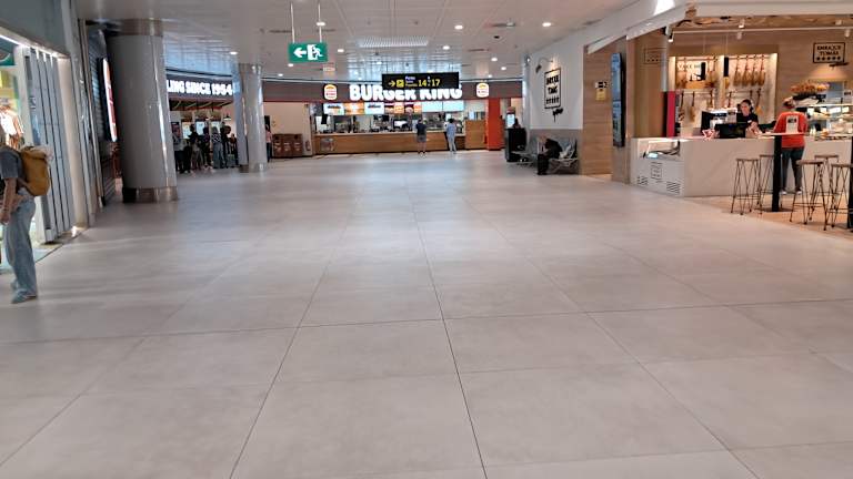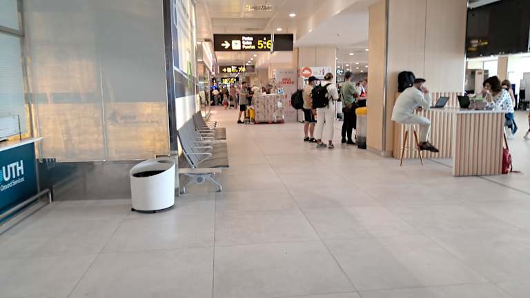 Nicht all zu großer Flughafen ,Im Aussen Bereich der Anflug und Abflughalle gibt es nur einen Catering und keinerlei Geschäfte sowie einen Info Stand und die Büros der Mietwagen Agenturen.Taxistände direkt vor dem Flughafen sowie auch die Parkplätze sich direkt gegenüber befinden.Die Mietwagen kann man im Parkhaus gegenüber abholen.Kurze Entfernung nach Ibiza Stadt und Playa en Bossa nur 6-8 km.Nach dem Check in im Innenbereich auch keine direkte Einkaufsmeile wie mittlerweile in fast jedem Flughafen,alles relativ klein gehalten.Ein Restaurant,ein Cafe,eine Bar und natürlich Burger King.Preise überall relativ hoch,man sollte vorher essen und trinken,Duty Free von den Preisen unverschämt teuer.Parfüm noch teurer als in Deutschland.So gut wie keine Angebote,Zigaretten bei der Stange teilweise 8 Euro Unterschied zu den Ortschaften,Auf jeden Fall vorher vor Ort kaufen und nicht am Flughafen,Duty Free Shop kann man garnicht nutzen alle Preise übermäßig hoch,Ein so genannter Hippie Laden mit bunten ausgefallen Sachen,Kleidung sowie auch Taschen,Einige nette Sachen dabei,aber auch nciht billig,Ein Souvenier Laden mit überwiegend Ibiza Artikel.aber auch nicht wirklich shopping würdig.Zum Schluss noch ein Delikatessen Geschäft mit landesüblichen Speisen und eine kleine Boutigue,aber auch nicht wirklich schöne Sachen.Gefallen hat mir persönlich nur der Hippie Laden.Seltene und ausgefallene Sachen und Kleidung,wenn man solches mag.Keine Raucherzone mehr nach dem Check in.