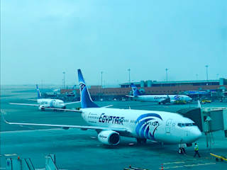 Der im Jahr 1963 eröffnete Flughafen von Kairo -offizieller Name: Cairo International Airport- (IATA-Code CAI, ICAO-Code HECA) liegt etwa 15 Kilometer nordöstlich des Geschäftsviertels der Stadt in Heliopolis. Bereits in den vierziger Jahren des 20. Jahrhunderts war das Gelände von der amerikanischen Air Force als Militärflughafen genutzt worden. Neben Linienflügen werden auch Charter- und Pilger- und Frachtflüge abgewickelt. Außer Südamerika kann jeder Kontinent vom Flughafen Kairo aus angeflogen werden. Ankommende und abfliegende Passagiere werden derzeit in drei durch einen Shuttlebus verbundenen Terminals abgefertigt. Außerdem gibt es ein Frachtterminal. Der Flughafen verfügt über drei bis zu vier Kilometer lange Start- und Landebahnen aus Asphalt, die für alle Flugzeugtypen geeignet sind. Im Flughafen gibt es Einkaufsmöglichkeiten sowie Banken, Wechselstuben, Geldautomaten, Autovermietungen, ein Postamt, Gastronomiebetriebe, Reisebüros, ein Fundbüro, eine Gepäckaufbewahrung und die Touristeninformation. Es sind ausreichende Parkmöglichkeiten vorhanden. Homepage: https://www.cairo-airport.com