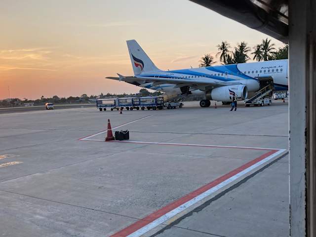 Am schnuckeligen Flughafen Koh Samui ist nun ein neuer Anbau (Abflughalle) fertig - bin zum ersten Mal von diesem neuen Bereich aus abgeflogen.....es ist ein geschlossener Raum - sehr spartanisch eingerichtet - mit unbequemen Sitzstühlen, einer Einbauecke, wo BKK Airways ihr gratis Kulinarium serviert (Kaffe-Tee-Automat, zwei Saftspender, Töpfe/Anrichten mit Leckereien usw.), ein paar PC´s - kostenloses Wifi möglich...insgesamt gesehen wirkt dieser Raum ziemlich kühl - ich hoffe, daß noch etwas Deko an den Start kommt....die offene Abflughalle wirkt irgendwie heimischer+inseltypischer....