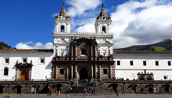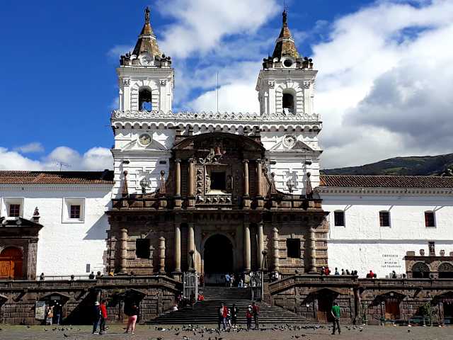 Das älteste christliche Gotteshaus Südamerikas, die "Iglesia San Francisco" liegt an der gleichnamigen Plaza über der Stadt. Beeindruckend ist der Blick auf die weiße Fassade mit ihren dunklen Verzierungen. Typisch für den spanischen Barock sind die goldüberladenen Wände und Decken. Der geschnitzte Hauptaltar mit der Statue der "Nuestra Senora de Quito" sowie das Chorgestühl sind charakteristisch für die Schule von Quito..