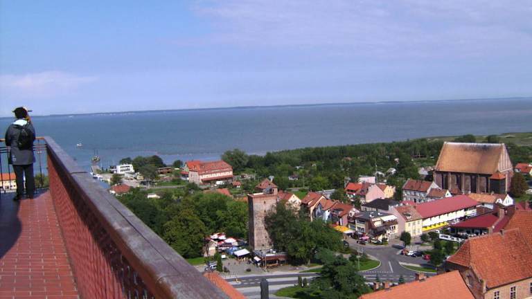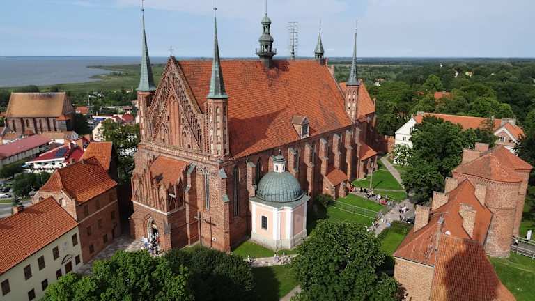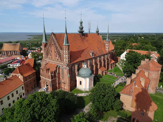 Fromburk/dt. Frauenburg liegt direkt am Zalew Wislany/dt. Frischen Haff. Die Altstadt wird von der unübersehbaren Domanlage weit überragt. Der Frauenburger Dom ist sehr sehenswert. Parken kann man gut auf dem großen Parkplatz an der Rückseite des Doms, wo auch sein Eingang ist. Gebührenpflichtige Parkplätze im ganzen Ort, allerdings liegt dieser hier recht günstig. Wer ein Navi hat, gibt am besten ul. Katedralna ein und fährt diese auch bis zum Ende durch. Vom Domeingang schräg rechts gegenüber ist dann der Parkplatz (ist ausgeschildert). Man betritt die Domanlage über eine Holzbrücke, welche über Fundamentreste einer vorigen Kirche führt und meint, man würde eine Festung besuchen, so wuchtig wirkt alles. An der Kasse kann man Kombitickets für verschiedene Museumsteile lösen. Ich hatte das 4-er Ticket für Museum, Aussichtsturm, Planetarium und die kleine heilige Kirche (sw. Ducha) etwas abseits. Für meine Begriffe lohnt es sich jedoch nicht, das Planetarium mit zu buchen, da der fast 1-stündige Vortrag über Sterne ausschließlich in polnisch läuft ;-(( Und auch die kleine heilige Kirche (sw. Ducha) etwas abseits lohnt für meine Begriffe weder das Geld noch den Besuch. Die Kirche als solche ist keine mehr, sondern ein Museum mit einigen wenigen Kunstausstellungsstücken und einem kleinen Kräutergarten dahinter. Daher ist es für meine Einschätzung ausreichend, ein 2-er Kombiticket für das Museum und den Aussichtsturm zu lösen. Der Eintritt für die in der Mitte der Domanlage befindliche Kathedrale muss ohnehin noch separat gelöst werden. Man betritt also durch den Eingang den Innenhof der Domanlage. Zunächst muss man zur Kasse für die Kathedrale, welche rechtsseitig ist. Die Kathedrale ist sehr prunkvoll ausgestattet und sehenswert. Das Museum rechtsseitig der Kathedrale ist ebenso sehr informativ und über 3 Etagen recht weitläufig. Teilweise deutsche Erklärungen vorhanden. Schreitet man dann über den Innenhof zur anderen Seite, kommt man auf der linken Seite zum Aussichtsturm. Dieser ist auf jeden Fall SEHR empfehlenswert. Nicht nur wegen seiner fantastischen Sicht von der Aussichtsplattform (gebührenpflichtiges Fernrohr ist vorhanden) über die Domanlage mit Kathedrale und den Ort Frauenburg bis weit über das Frische Haff nach Rußland (die sichtbare andere Seite der Frischen Nehrung ist bereits Rußland). Auch der Aufstieg im Turm ist sehr lehrreich. Im Turm hängt das sogenannte Foucault´sche Pendel an einem 28 m langem Seil, welches die Entdeckung von Foucault, dass die Erde sich dreht, dokumentiert. Erklärungen hierzu in polnisch, deutsch und englisch. Unter dem Eingang zum Turm geht es in das Planetarium. Verlässt man die Domanlage und hält sich rechts und biegt danach nochmals rechts den Weg ab, der hinab führt, kommt man schnell zur Ortsmitte mit einer weiteren Kirche (gegenüber ist das Kopernikus-Denkmal am Fuße des Doms), einen eh. Wasserturm, den man ebenfalls kostenpflichtig besteigen kann (er ist aber weit weniger hoch als der Aussichtsturm in der Domanlage) und einigen wenigen Gaststätten. Geht man weiter am Fuße des Doms entlang, kann man über einen Fußweg durch den Torbogen wieder hinauf steigen zum Parkplatz. Ich fand diesen Ausflug sehr informativ und sehenswert.