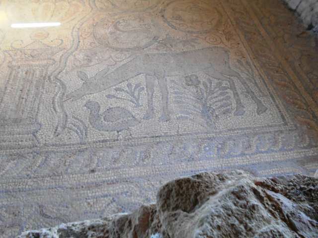 Schöne Mosaike in der Ruine. Offiziell gesperrt aber das Tor lässt sich öffnen. Sehr schlechter Piste vom Hinweisschild zum Strand folgen, dann rechts ein paar Meter dem Strand folgen. Das Schutzdach der Ruine ist im Gestrüpp zu sehen.