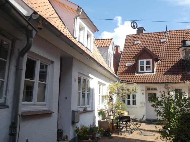 Man sollte sich Zeit nehmen für die Altstadt von Lübeck. Abseits der grossen Geschäftsstrassen sieht man in den Häuserfronten neben normalen Haustüren hier und da einen Gang, der manchmal sehr schmal oder auch sehr niedrig sein kann. Es lohnt sich hier einmal durchzugehen und hineinzuschauen. Staunend steht man dann in einer praktisch anderen Welt. Kleine Budenhäuser umgeben einen kleinen Platz, oder aber der Hof ist wunderschön dekoriert. Man kann sich nicht sattsehen an den vielen liebevollen Kleinigkeiten und Gärten, die die Bewohner hier hergerichtet haben.