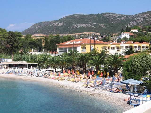 Der Strand liegt vom Hafen gesehen, 15 Gehminuten in östlicher Richtung. Der Strand selber ist sehr sauber, mit kristallblauen Wasser. Beeindruckend für einen Stadt Strand. Die Liegen kosten 3 Euro, das Taxi zurück ins Zentrum ebenfalls 3 Euro. Der Strand hat was ganz toll ist, Bedienung,die sich die Lounge Bar(super Musik)Joka, das Htl. Iona Maris und das Restaurant Vergina teilen.