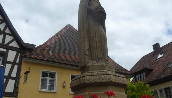 Nach der Besichtigung der Pfarrkirche St. Bartholomäus machten wir noch eine Mittagspause im naheliegenden Gasthof goldene Krone. Der Gasthof befindet sich im Ortszentrum im Marktplatz 2. Das Gasthaus hat auch einen Biergarten, wir entschieden uns jedoch für einen Platz in der kleinen rustikalen Gaststube. Im hinteren Teil des Gasthauses befindet sich auch noch eine größere Gaststube. Wie man im Internet lesen konnte, handelt es sich beim Wirtshaus „Goldene Krone“ um einen Traditionsgasthof (seit 1770), mit gepflegt-fränkischer Gastronomie. Die Speisekarte ist umfangreich und orientiert sich stets an den Produkten der Region und Saison. Der freundliche Gastwirt brachte uns sofort die Speisekarte. Das Angebot von Speisegerichten auf der Speisekarte fand ich vollkommen in Ordnung. Wir haben uns für Schweinelendchen in Pfefferrahmsauce mit Kroketten ( 16,60 Euro ) entschieden. Als Getränk bestellten wir ein leichtes Weißbier ( 4,70 Euro )und ein Cola Mix ( 4,00 Euro ). Die Getränke und das Essen wurden uns nach kurzer Zeit gebracht. Die Portionen fand ich in Ordnung. Ich fand das Schweinelendchen in Ordnung, meiner Ehefrau war das Schweinelendchen jedoch zu trocken. So verschieden sind die Geschmäcker. Nebenbei erwähnt, vor dem Gasthof befindet sich der bekannte Elisabethbrunnen. Der Elisabethbrunnen ist auch als Osterbrunnen bekannt. Wie uns ein Einheimischer erzählte, schmücken jedes Jahr 1600 Eier den Brunnen in der Stadtmitte. Der Brunnen soll auch daran erinnern, dass die hl. Elisabeth, die im Jahre 1228 auf der Burg Pottenstein weilte, die Armen verköstigte. Als sie ihr Mann einmal argwöhnisch fragte, was sie im Korb hat, antwortete sie: Rosen. Ihr Mann schaute nach und tatsächlich. Der Korb war voller Rosen, anstatt Lebensmitteln.