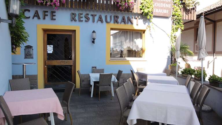 Das Restaurant "Goldene Traube" befindet sich am südlichen Ende des Rathausplatzes. Das blaue Haus kann man eigentlich gar nicht verfehlen. Leider sind keine eigenen Parkplätze vorhanden. Wenn man Glück hat, kann man am "Marktl" parken, ansonsten auf dem ca. 500 m weiter unten gelegenen gebührenfreien Parkplatz vor dem Bürgerhaus. Beim Betreten des Lokals hat man erstmal den Eindruck, eine Zeitreise zu machen. Die Einrichtung ist schon etwas älter, es ist aber alles sehr gepflegt und sauber. Ein krasser Gegensatz zum Restaurant ist die gemütliche Stube, die allerdings nur zu bestimmten Anlässen geöffnet ist. Bei schönem Wetter kann man auf der kleinen Terrasse vor dem Haus sitzen. Auf der Speisekarte findet man regionale und sonstige gut bürgerliche Gerichte, teilweise mit einem mediterranen Einschlag. Wir haben zweimal in der "Goldenen Traube" zu Abend gegessen und waren beide male sehr zufrieden. Das Essen wird frisch zubereitet und sehr heiß serviert. Der Service läßt keine Wünsche offen. Man wird freundlich und flink bedient und gut beraten, auch was die passenden Weine betrifft. Die Wirtsleute sind stets präsent und kümmern sich persönlich um das Wohl der Gäste. Wir können die "Goldene Traube" guten Gewissens weiterempfehlen.