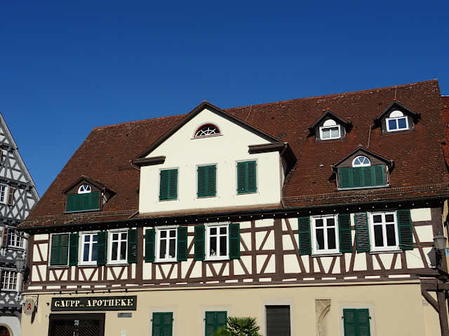 Eigentlich ist eine moderne Apotheke keine "Sehenswürdigkeit" im Sinne von Historie aber sehr wohl, vor allen Dingen wenn diese Apotheke auch einen historischen Apothekenkeller besitzt. In dieser Historischen Apotheke kann man sehen, wie solch ein Geschäft in den frühen Jahren aussah und welche Medikamente der Apotheker damals herstellte. Dort kann man auch die Apparate sehen, die heute total unmodern sind , denn die meisten Präparate werden von den Pharmafirmen geliefert. Aber durch den Sitz der Apotheke : Am Marktplatz 1 zählt durch das Fachwerkhaus auch das Äussere zur Historie. Nun, auch diese Apotheke lebt von den Kunden, deshalb sollte man sich anmelden, wenn man die alte Apotheke im Keller besichtigen will. Tel:07181-939810