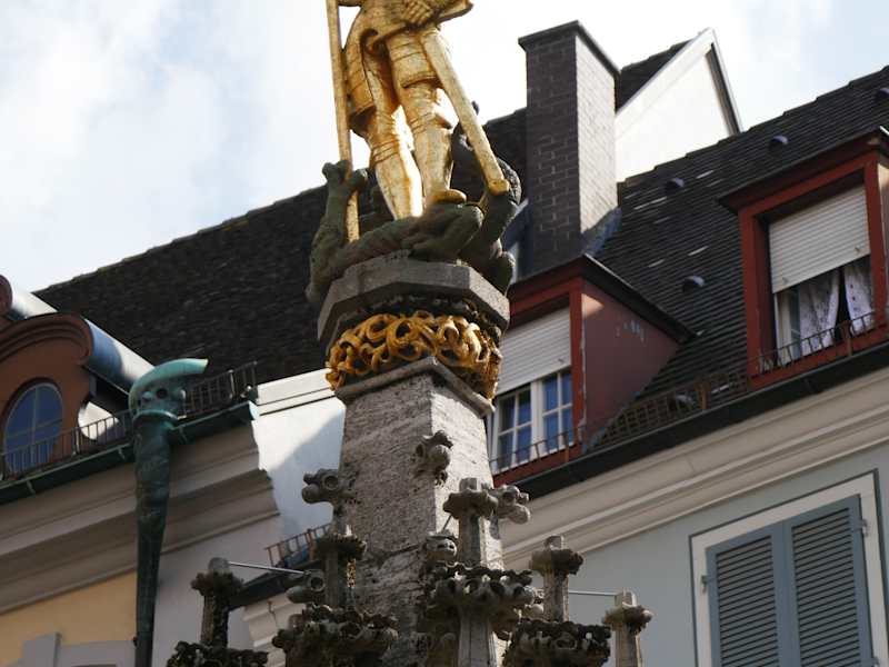Der Freiburger Stadtpatron ist der Heilige Sankt Georg. So ist es klar daß diesem Held auch ein Denkmal mit Brunnen gewidmet ist. Der mittelalterliche Brunnen ist seit dem 15. Jh hier zu bestaunen, im Laufe der Jahrhunderte wurde er mehrfach umgebaut. Da Freiburg den wasserreichen Fluß, den Dreisam hat, konnnte man schon früh Trinkwasser gewinnen. Es wurde schon ab 1317 in öffentlichen Brunnen gesammelt, wobei man Bäume so aushöhlte, daß sie wie Röhren wirkten, in welchem das Wasser zu den Brunnen leitete. In den Jahre 1810 bis 1855 wurden dann die Röhren durch Gusseiserne ausgetauscht. Die Brunnenschale vom Georgsbrunnen wurde im Jahr 1935 durch Muschelkalkstein ausgewechselt. Heute gibt es 4 Ausflüsse mit Verzierungen und St. Georg strahlt als vergoldeter Held.
