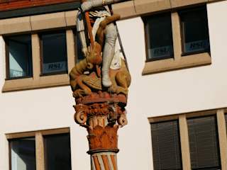 Ursprünglich stand an diesem Platz wohl eine Georgskirche/St.Georgskapelle. Auf der Brunnensäule wird dargestellt, wie der heilige Georg einen Drachen ersticht. Aufwändiges Brunnenfotomotiv.