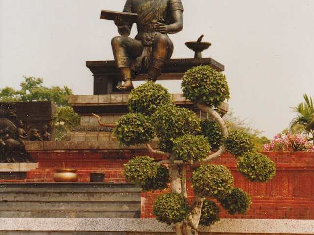 Die alte Königsstadt Sukhothai liegt etwa 430 Kilometer nördlich von Bangkok. Sie wurde im Jahr 1238 gegründet und war die erste Hauptstadt Siams. Wenn es einen König der frühen Landesgeschichte gibt, der nicht nur die politische und kulturelle Identität der Thai entscheidend beeinflusste, sondern zudem bis auf den heutigen Tag von der Bevölkerung geliebt und verehrt wird, dann ist es König Rama Khamhaeng. Er herrschte von 1279 bis 1298. Die Könige der Chakri – Dynasie von Thailand werden Rama genannt. Der Name Rama wurde von dem hinduistischen Gott Rama übernommen. Rama Khamhaeng hat als König und Oberbefehlshaber und mutiger Krieger dem Reich von Sukhothai zu einer enormen Ausdehnung verholfen. Das Denkmal für Rama Khamgaen befindet sich im Zentrum des inneren Bereiches des Geschichtsparks Sukhothai. 1988 hat der thailändische König Bhumibol Adulyadej den Geschichtspark eingeweiht, 1991 wurde er zum UNESCO Weltkulturerbe. Der Mittelpunkt des Denkmals besteht aus einer Bronzestatue des Königs in sitzender Position auf einer Nachbildung des Manangkhasila-Asana-Throns. Das Monument Rama Khamgaen wurde zu Ehren und zum Gedenken an König Rama Khamgaen errichtet, den großen König der Sukhothai-Zeit. Er galt als weiser Herrscher. Eine seiner größten Errungenschaften war die Zusammenstellung eines Schriftsystems und eines neuen thailändischen Alphabets, das er aus den verschiedenen zuvor verwendeten Formen der Khmer-Schrift anglich. Das Alphabet, das König Rama Khamhaeng im Jahr 1283 erfand, ist im Wesentlichen dasselbe wie das, das heute in Thailand verwendet wird, und er wird manchmal als „Vater der thailändischen Sprache“ bezeichnet. König Rama Khamhaeng erhob auch keine Steuern auf den Handel und den Transport. Die Statue von König Rama Khamhaeng sitzt auf einem 4 m langen und 2,88 m breiten Thron. Die rechte Hand hält eine Schriftstelle und die linke ist in einer Vortragsposition. Links vom Thron befindet sich ein Dolch. Die Statue des Königs ist aus Bronze und Kupfer gegossen und wiegt etwa 3 Tonnen. Die Merkmale der König-Rama-Khamhaeng-Statue sind die einer feinen, antiken Skulptur mit korrekter Darstellung von Gesicht und Körper eines Aristokraten während der Sukhothai-Zeit. Das Gesicht wurde ebenfalls als Buddha-Bild im Sukhothai-Stil geformt. Unser Reiseleiter erzählte sehr ausführlich die Geschichte von Rama Khamhaeng. König Rama Khamgaen genießt immer noch großen Respekt als der König, der den Stil der wohlwollenden Monarchie einführte, die bis heute Bestand hat.