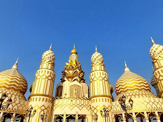 Das Global Village liegt vor den Toren Dubais und erscheint von aussen ein spannender Ort in dem aus allen Herren Ländern Teile nachgebildet worden sind, schön beleuchtet bei Nacht. Es hat nur zur Winterzeit auf und dann fährt die Orange Linie des Sightseeing Busses dorthin. Eintritt gering . Leider haben sich unsere Erwartungen nicht erfüllt, eine Art Jahrmarkt in Kulissen sind überall Händler und wollen Waren verkaufen, recht aufdringlich. Essenstände überall, Kamele in viel zu kleinem Gehege, Toiletten sind sauber. Eine seltsame künstliche Welt Dimnge zu kaufen die man eigentlich nicht braucht wie auf unseren Jahrmärkten (sogar deutsche Pfannen haben wir gesehen) - wir fanden den Tag verschwendit, der Zauber hat uns nicht getroffen !