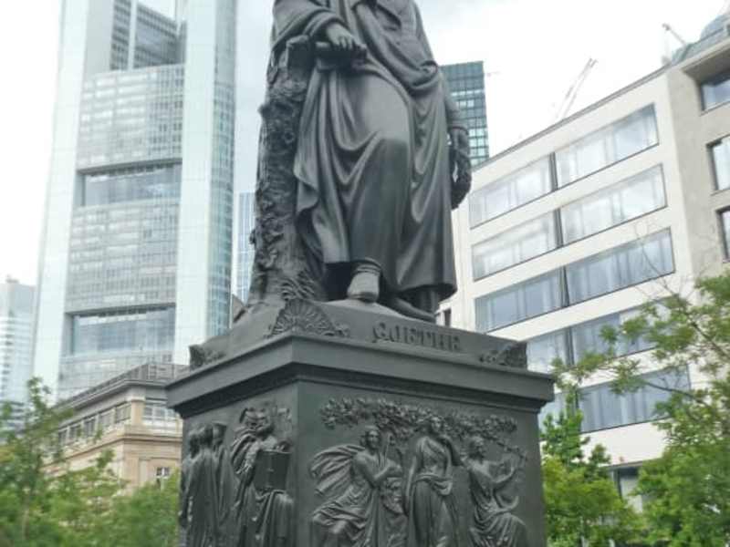 In Frankfurt wurde im Jahr 1844 in der Stadtallee, dem heutigem Goethe Platz, ein Denkmal für den großen Sohn der Stadt „Johann Wolfgang Goethe“ errichtet. Das Geld für diese Denkmal wurde nicht von der Stadt oder einer staatlichen Stelle gegeben, sondern von den Bürgern der Stadt gesammelt. Im Zweiten Weltkrieg stark beschädigt, wurde es 1952 in der Gallus-Anlage aufgestellt und kam erst 2007, nach dem Umbau des Goetheplatzes, wieder an seinen alten Platz auf den Goetheplatz. Goethe steht – überlebensgroß aus Bronze gegossen - auf einem Sockel, auf dem u.a. Szenen aus seinen Werken dargestellt sind. Der wohl berühmteste Frankfurter wurde am 28. Aug. 1749 als „Johann Wolfgang Goethe“ (also ohne „von“) geboren. Er stammte aus einer in Frankfurt hochangesehenen, reichen, bürgerlichen Familie. In Frankfurt ist Johann Wolfgang Goethe aufgewachsen und hat bis zu seinem 26. Lebensjahr hier gelebt (unterbrochen von seinen Studienaufenthalten in Leipzig und Straßburg, sowie kurzem Aufenthalt in Wetzlar, wo er als Advokat tätig war). Mit 26 Jahren wurde er nach Weimar an den Hof von Herzog Karl August von Sachsen-Weimar-Eisenach eingeladen, wo er dann – mit einigen Unterbrechungen (wie z.B. der zweijährigen Italienreise) bis zu seinem Lebensende lebte. Goethe war in Weimar u.a. Minister und Leiter des dortigen Hoftheaters. In den Adelsstand wurde Goethe 1782 erhoben und nannte sich nun „von Goethe“. Goethe verstarb am 22. März 1832 in Weimar.