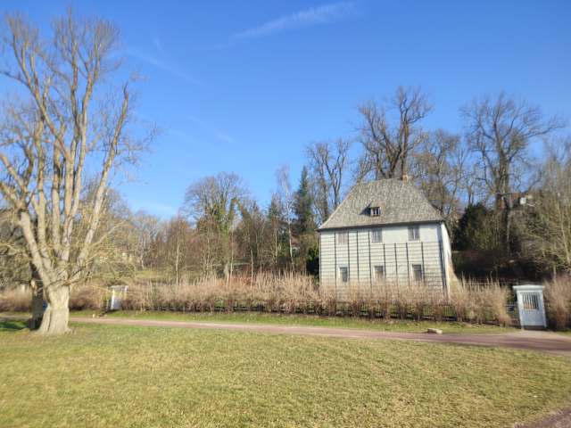 Das wunderschöne Gartenhaus von Goethe im PArk an der Ilm gehört mit zum Weimarer Weltkulturerbe. Schon lange vor seinem bekannten Wohnhaus kam Goethe in den Besitz des Gartenhauses. Goethe selbst legte den Garten an und arbeitet mit an der Renovierung des Hauses. Seine Wohnhäuser in Weimar wechselten, doch das Gartenhaus blieb seine Lieblinsaufenhaltsort in Weimar. Noch in seinem Todesjahr war er hier. Täglich außer Montags, Eintritt € 6.-