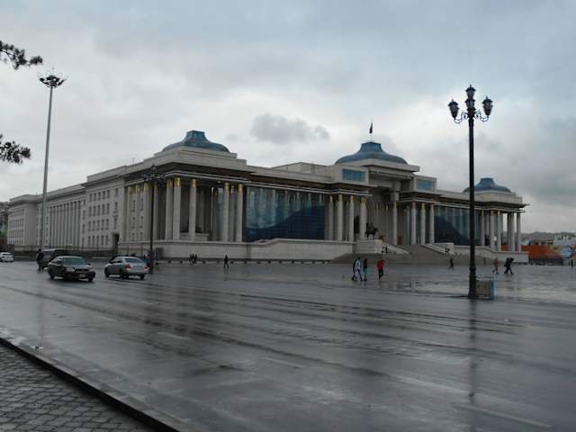 Parlament und Abgeordnetenbüros, Regierung und Staatspräsident – sie alle haben ihren Platz im zentralen „Government House“, dessen Nord-Fassade mit seinem marmornen Kolonnaden-Denkmal zu Ehren des Reichsgründers Dschingis Khan zum Sukhbaatar-Platz zeigt.