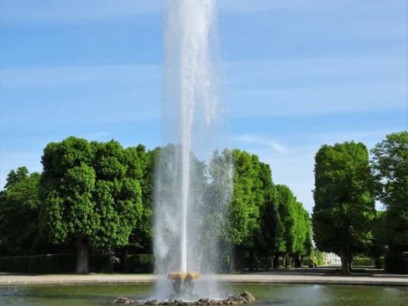 Eines der Highlights der Herrenhäuser Gärten ist ohne Frage die „Große Fontäne“ im Mittelpunkt des Nouveau Jardin, dem südlichen Parkteil des Großen Gartens mit seinen von Hainbuchenhecken eingefassten Gehölz-Dreiecken, Alleen und kleinen Springbrunnen. Die zentrale Fontäne wurde bereits 1700 erbaut und nachdem Probleme mit der Wasserzufuhr gelöst werden konnten, erhob sich 20 Jahre später erstmals der Wasserstrahl 36 Meter in den Himmel. Die Pumpen der Fontäne wurden von Wasserrädern angetrieben und die Technik im Laufe der Zeit immer weiter perfektioniert: 1856 erreichte die Fontäne bereits 56 Meter Höhe und mit dem heutigen elektrischen Pumpenantrieb beachtliche 72 Meter. Bereits bei der Entwicklung bediente man sich eines Tricks, denn der scheinbar massive Wasserstrahl ist in Wirklichkeit „hohl“ – das Wasser wird nämlich über einen kreisförmigen und nur wenige Millimeter weiten Schlitz gepresst und erreicht am Auslass eine Geschwindigkeit von 140 Km/h. Schon damals ein kostspieliges Prestigeobjekt, gilt die „Große Fontäne“ auch nach 300 Jahren immer noch als höchste Gartenfontäne Europas.