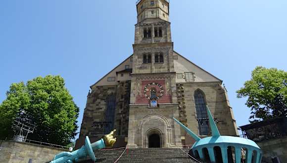 Die große Freitreppe (erbaut 1507) ist ein markanter Blickfang am Marktplatz und führt zur Kirche St. Michael hinauf. Von vor der Kirche hat man dann einen tollen Blick über den Marktplatz und über Teile der Altstadt. Seit den 1920ern finden auf der Freitreppe im Sommer Freilichtspiele statt.