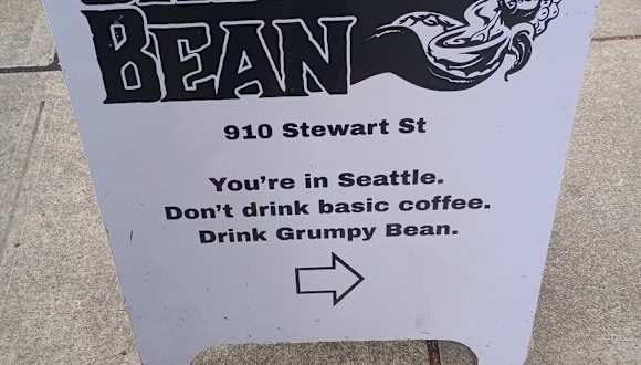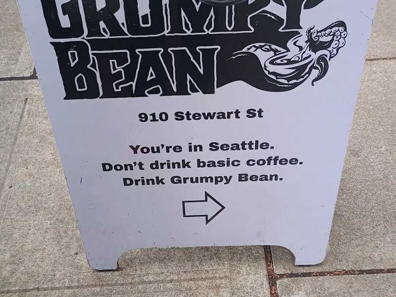 Seattle ist berühmt für seine Kaffeekultur, und das merkt man überall. Aber es ist immer besser, die lokalen Cafés zu besuchen, wo man den besten Kaffee probieren kann. Und das Grumpy Bean ist eines von ihnen. Toller Kaffee (Geschmack und Gefühl) zu guten Preisen. Da ich meist morgens arbeite, kann ich mir ein Glas nehmen und in die Stadt gehen.