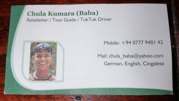 Hallo, das ist Baba Ihr Reiseguide für Sri Lanka. Wenn Sie auf der Suche nach ein- oder mehrtägigen Ausflügen sind, ist er die beste Adresse in Sri Lanka. Zu seinem Fuhpark gehört ein Tuk-Tuk und ein klimatisierter Reisebus. Zudem spricht er sehr gut Deutsch und Englisch. Er wird sich mit Ihnen zusammensetzen und individuelle Ausflüge mit planen. Er geht auf all Ihre wünsche ein, egal ob Sie allein, mit Ihrer Familie oder in einer Gruppe reisen. Nähere Informationen finden sich unter Baba-Lanka Koggala www.baba-lanka.de Facebook :- https://www.facebook.com/chulakumara.baba E-Mail: baba@baba-lanka.org Handy:-+94 0777 9401 42