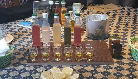 Wir hatten bereits im Internet viel über Schorsch und seine Touren gelesen und uns dann bereits von zu Hause aus für die Zeus-Tour entschieden. Wir wurden 7.20 Uhr am Hotel in Anissaras abgeholt, dann noch ein weiteres Pärchen und dann ging es direkt zur Farm von Schorsch; er hatte in zwischen ein weiteres Pärchen für diese Tour abgeholt. Mit einem leckeren griechischen Frühstück und sehr viel Herzlichkeit begannen wir den Tag und danach gings auch schon los, unsere Offroad-Tour. Gefahren wurde mit 2 Autos-in jedem 3 Gäste und per Funk wurde alles übertragen, was Schorsch über seine Heimat zu erzählen hatte. Es gab viel Wissenswertes über Land und Leute und natürlich die Natur und seine Kräuter (eine Kräutertasche hatte jeder vorm Start bekommen). Erster Stop war an einer Steinhütte, in die wir auch reingehen konnten. Viele davon werden noch genutzt, nächster Stop war die Zeus-Höhle, in welcher Zeus aufgewachsen sein soll. In dieser lag sogar Anfang Juli noch Schnee, beeindruckend. Dann ging es weiter und gg. 13 Uhr gab es in einer herrlich gelegenen Taverne ein super leckeres Mittagessen und natürlich Getränke. Und dort überraschte uns dann ein ordentlicher Regenguss, aber mit einem Ouzo ist das gar kein Problem. Danach ging es zurück auf die Farm und dort war bereits eine kleine Verkostung vorbereitet: Honig, Olivenöl, Ouzo in verschiedenen Geschmacksrichtungen. Natürlich haben wir eine Kleinigkeit für zu Hause eingekauft und wurden herzlichst verabschiedet. Sollten wir nochmals auf Kreta zu Gast sein, gibts sicher auch wieder ein Tour mit Schorsch. Wir hatten einen wunderschönen, erlebenisreichen Tag und waren nach 16 Uhr wieder mit all den tollen Eindrücken in unserem Hotel.