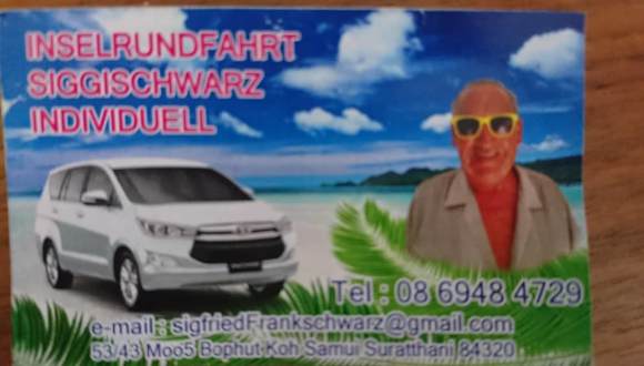 Schöner Tag auf Koh Samui Wir haben Siggi im Meer vor unserem Hotel getroffen und eine Inselrundfahrt gebucht. Er ist auf unsere Wünsche eingegangen und hat uns interessante Plätze gezeigt. Sogar eine Rumverkostung und ein Mittagessen in einem Lokal, in dem auch Thais essen, haben wir erlebt. Der Ausflug ist zu empfehlen.