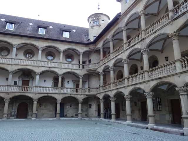 Die historische Glocke aus dem 16. Jahrhundert steht ein wenig versteckt in einer Ecke des Schlosshofes des Alten Schlosses. Die Erklärtafel ist kaum noch entzifferbar. Die Glocke stammt demnach ursprünglich aus dem Kloster Neresheim. Schönes Fotomotiv.
