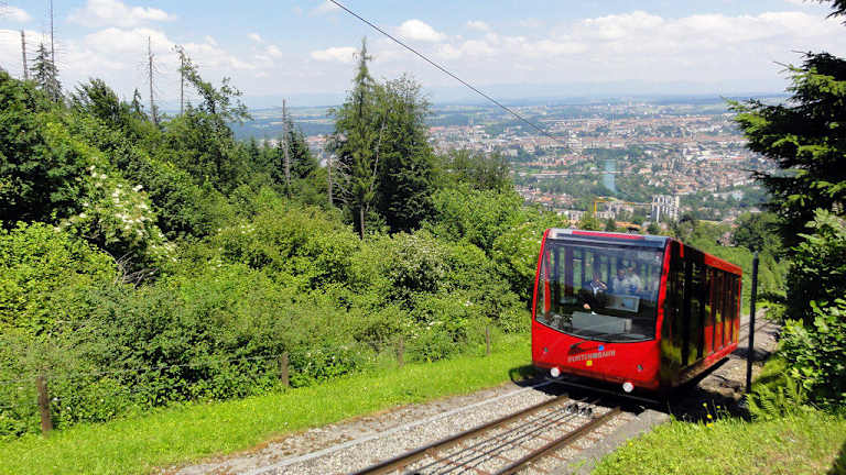 Der Gurten (ca. 840 m ü NN) ist der Berner Hausberg. Man erreicht die Talstation der Gurtenbahn mit der Tram Linie 9 (Richtung Wabern) vom Bärenplatz und Bahnhof in ca. 10 Minuten (alle 6-8 Minuten). Die Gurtenbahn ist eine Standseilbahn und benötigt bis zur Bergstation 5 Minuten, dabei werden etwa 270 Höhenmeter überwunden. Fahrpreis für die Berg- und Talfahrt beträgt 10,00 CHF. Man kann auch in Euro bezahlen (nur Scheine), bekommt dann jedoch CHF zurück! Sehr schön ist der Ausblick auf Bern und die Schweizer Alpen z.B. auf dem Gurten-Rundweg (Fußweg ca. 30-60 Minuten). Besonders Familien mit Kindern sollten bei einem Bern mit der Gurtenbahn fahren. Auf dem Güschi-Weg können Kinder die lokalen Tiere erleben und auf dem großen Spielplatz fährt eine Liliputeisenbahn. Ab hier oben beginnt auch eine Downhill-Strecke für Mountainbiker und hier findet auch das größte Schweizer Open-Air statt, das Gurtenfestival. Ja und Spazier- und Wanderwege gibt es natürlich auch :-), es gibt eine kostenlose Broschüre mit Wanderkarte und Wandervorschlägen an der Talstation.