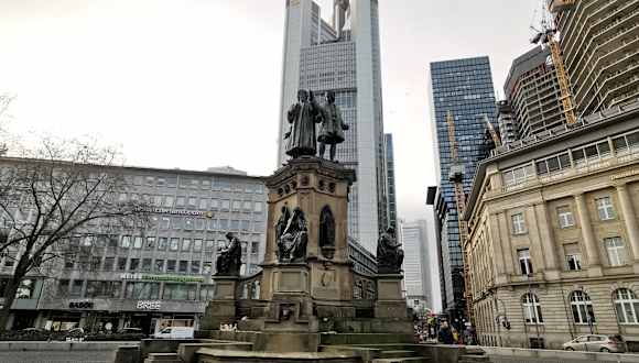 Auf dem Roßmarkt von Frankfurt befindet sich das Johannes-Gutenberg-Denkmal bzw. der Johannes-Gutenberg-Brunnen. Johannes Gutenberg hieß mit Geburtsnamen eigentlich Johannes Gensfleisch (geboren um das Jahr 1400 in Mainz, gestorben 1486 ebenfalls in Mainz). Gutenberg gilt als der Erfinder des Buchdrucks mit beweglichen Metall-Lettern und auch der Druckpresse. Aber das Denkmal hier in Frankfurt auf dem Roßmarkt gehört nicht nur Gutenberg, sondern mit ihm sind auch seine Geschäftspartner, der Buchdrucker und Verleger Johannes Fust (geboren um das Jahr 1400 in Mainz, gestorben 1466 in Paris) und der Buchhändler und Verleger Peter Schöffer (geboren um 1425 in Gernsheim, gestorben um 1503 in Mainz). Fust und Schöffer waren wichtige Unterstützer von Gutenberg und waren mitverantwortlich für seinen Durchbruch und Erfolgt. Das Denkmal steht in hartem Kontrast zu den Hochhäusern vom Bankenviertel, die als Hintergrund fungieren – und was somit einen ganz besonderen Reiz ausübt. Wenn man am Roßmarkt oder in der Nähe vom Roßmarkt ist, so sollte man sich einen Besuch beim Denkmal für Johannes Gutenberg (Johannes Gensfleisch) und seinen Partnern überlegen.