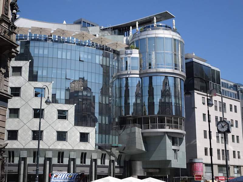 Das heutige Haas Haus gegenüber dem Stephansplatz ist ein moderner Baukörper. Die Aussenfassade besteht diagonal aus Mauerwerk und normalen Fenstern, die andere Hälfte, aus verspiegelten Fenstern. Vom Stephansplatz gibt es Standpunkte, von dort kann man sich den Stephansdom spiegeln sehen. Bevor ich nach Wien fuhr, hatte ich oben auf dem Dach Sonnenschirme gesehen, glaubte dann dort oben ist ein Café, von dort sieht man herrlich auf den Steffl. Als ich dann versuchte dieses vermeintliche Café zu betreten, wurde ich nicht eingelassen, denn das ist die Aussenbewirtschaftung des Hotel DO & CO. Auch mit netten Worten und der Versicherung, daß wir dort frühstücken wollten, natürlich gegen Bezahlung, nein sorry, geht nicht, nur für Hausgäste. Wegen Reichtum geschlossen, ich kann in den meisten Hotels gegen Bezahlung frühstücken. Und in dem unteren Stock, ist die Bar Onyx, dort dürften wir hinein, aber dort gibt es nur Fenster die so dunkel sind, wegen Verspiegelung, dort wollten dann wir nicht hinein. Das Haus ist ein Blickfang, wurde auch tausende Mal fotografiert.