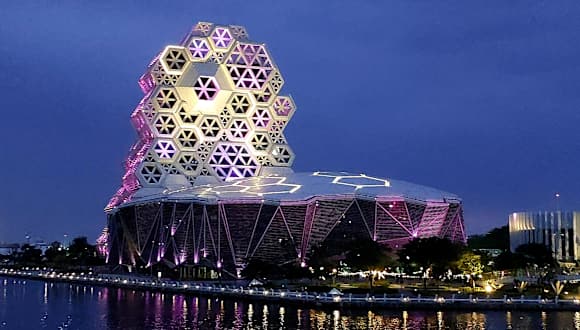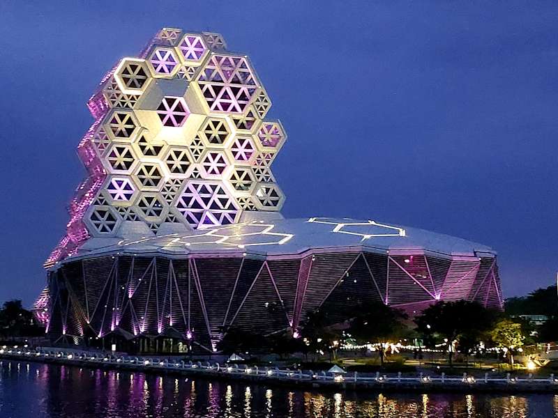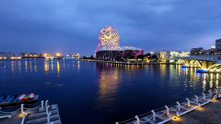 Ein Spaziergang am Glory Pier ist besonders schön am Abend wenn alles bunt beleuchtet ist. Vom etwas erhöhten Dolphin Walkway Boardwalk hat man einen fantastischen Blick auf das Theater, das Kaohsiung Music Center und die Love River Bay mit dem Love Pier.