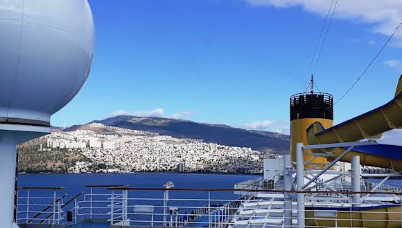 Achtung, Kreuzfahrer! Die teure Stadtrundfahrt der Reedereien kann man sich sparen. Wenn man in Izmir aus dem Kreuzfahrtterminal herauskommt und über den großen Platz mit dem Anker-Denkmal in der Mitte geht, sieht man geradeaus, am Rand, den weißen Hop On - Hop Off - Bus der Stadt Izmir stehen. Mit diesem fährt man für 10 € ca. 1 Stunde lang zu Sehenswürdigkeiten in der Stadt, auch zu den Ausgrabungen. Je nach dem, wie lange man Zeit hat, kann man am Hauptbasar aussteigen, dort bummeln und wieder zusteigen. Per Audio-System sollten die Informationen in verschiedenen Sprachen erhältlich sein (ich bekam nur den italienischen Kanal).